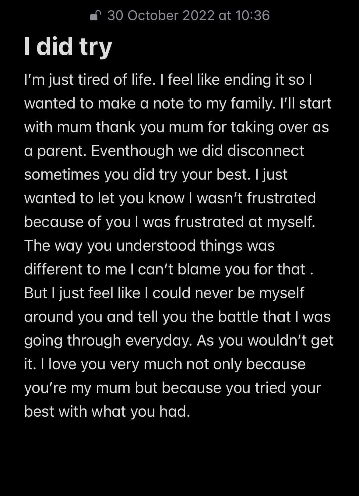 Fast forward to four years later I went through the same issue. But instead I was 18 and in University. I remember it just like it was yesterday. I sat in my room crying for hours. Enraged, tired, fatigued. An overall mess. I picked up my phone went on notes again and started to write the note again. This time I accomplished actually write something. This is what it said: